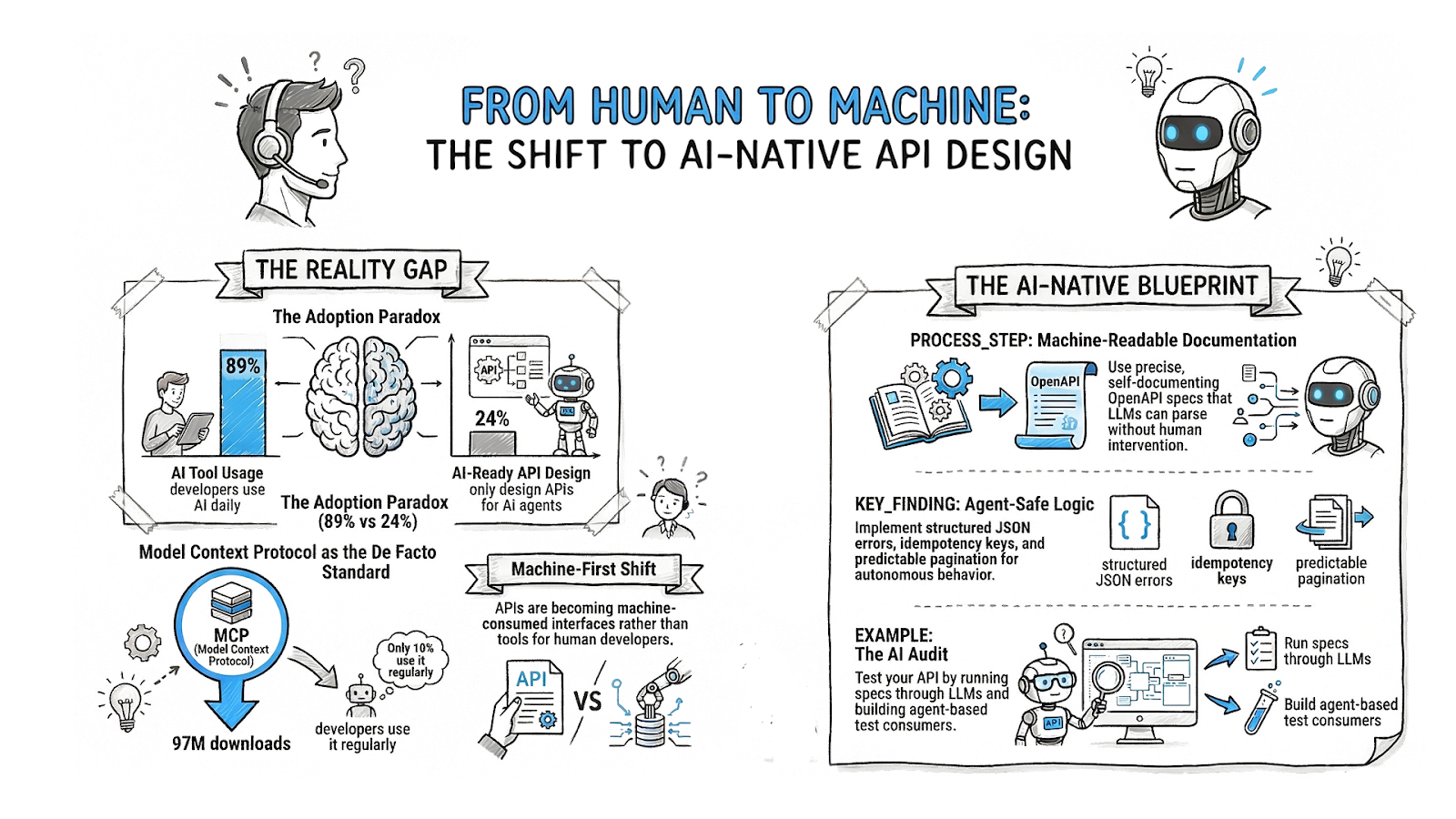 AI is transforming APIs from human-developer tools into machine-consumed interfaces, demanding new design patterns that prioritize machine readability, predictable schemas, and discoverability.
