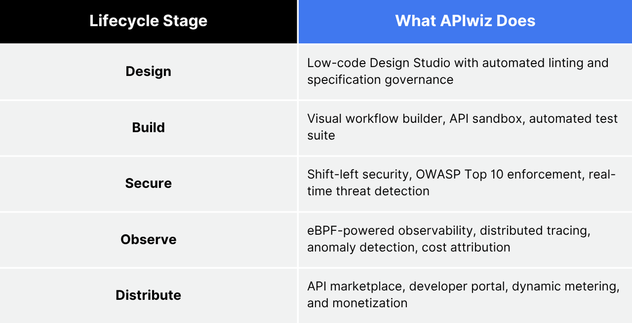 APIwiz is a federated API management platform that covers the entire API lifecycle from design through monetization, with observability woven into every stage.