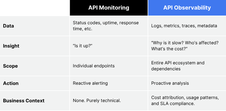 API monitoring tells you what happened — uptime, response codes, error rates. API observability tells you why it happened — root causes, dependencies, behavioral patterns, and business context.